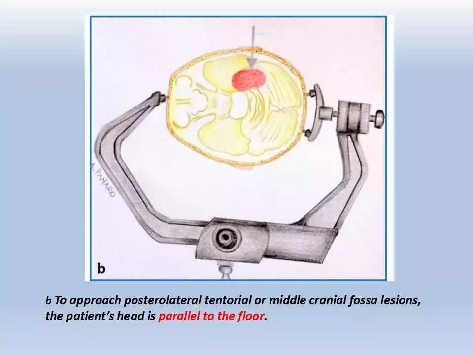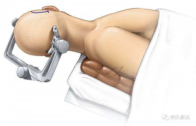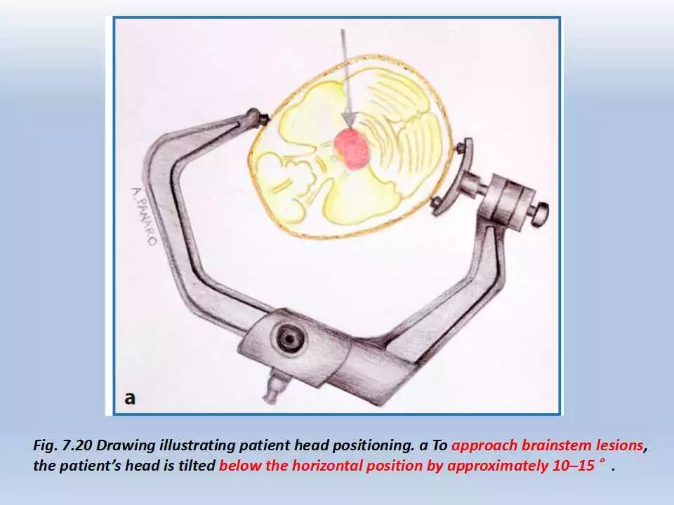 对于颅底深部病变的手术,将头部置于合适的位置至关重要。患者的头部应该正对术者,能达到对病变组织充分的暴露,同时对脑组织最小程度的牵拉,并且可以提供灵活的工作角度。除此之外,在术中,患者头部的放置应该使术者处于一种符合人体工程学的舒适的体位。