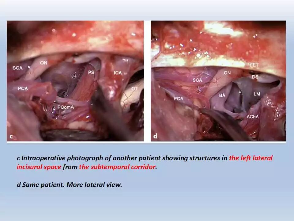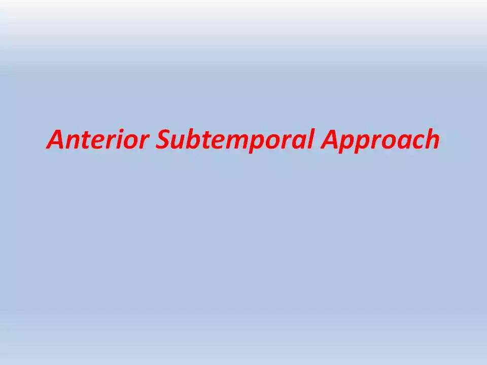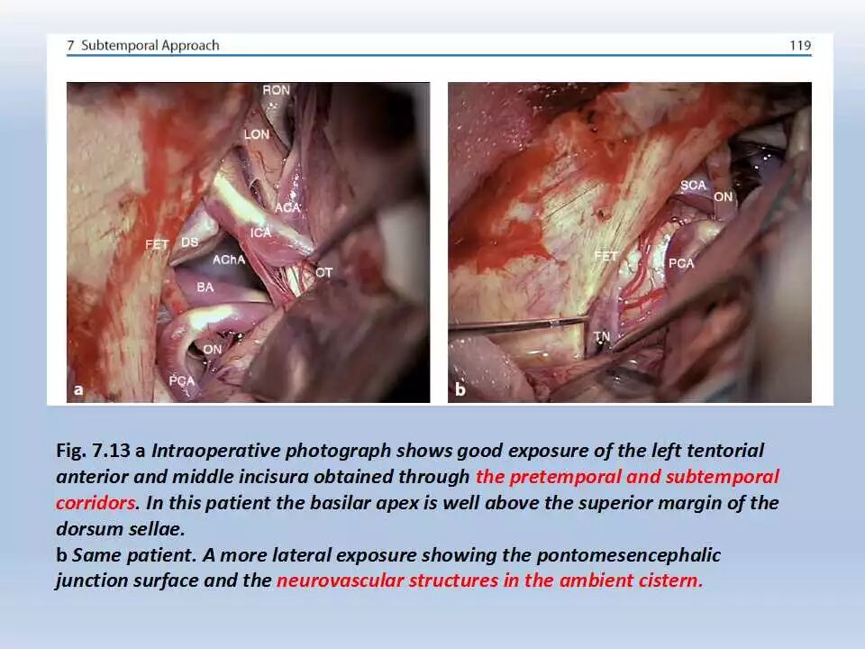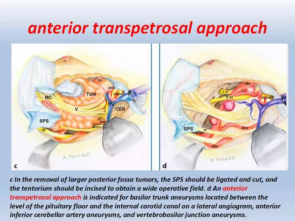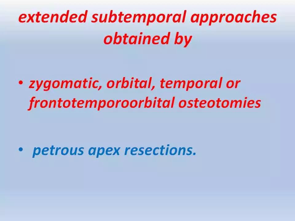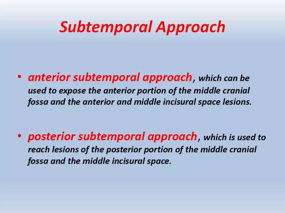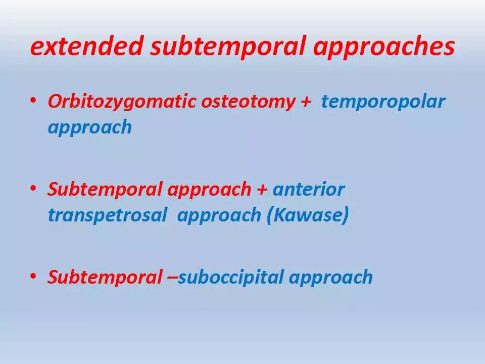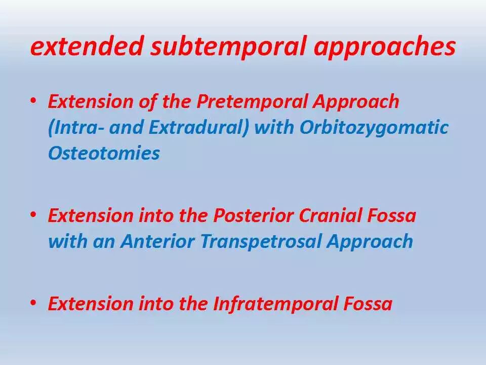 除此之外,这一入路可用于修复上半规管的破裂。颞下入路可与扩大翼点入路相结合,用以暴露脚间池的复杂血管畸形以及扩展到天幕裂孔和视交叉旁区的多间隔的纤维型脑膜瘤。
