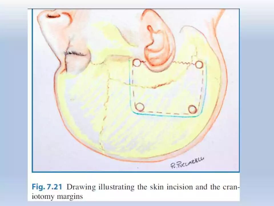 如果预计脑组织张力较高,应该在切皮前使用甘露醇(1g/Kg)。如果考虑使用脑皮层刺激用于功能定位,应该备有冷的乳酸钠林格液。对于颞下入路,无论肿瘤的大小,为了在硬膜下或硬膜外抬起颞叶时最大程度减少对颞叶牵拉而造成的损伤,我通常会在绝大部分病人中行腰大池置管引流。在抬起颞叶时,尚不能到达基底池放液,因此这种备用的释放脑脊液的方法大有裨益。