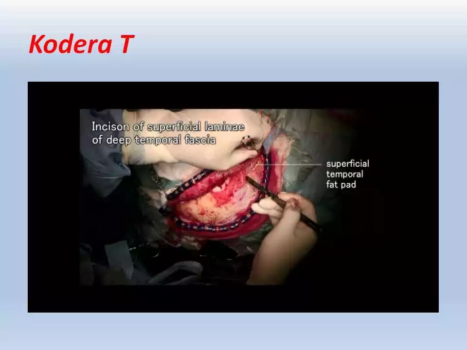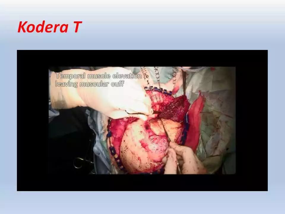 当采用直切口时,从颞肌附着的颞上线水平离断颞肌可最大程度减少对皮瓣的牵拉,并且提供充足的骨质的暴露。