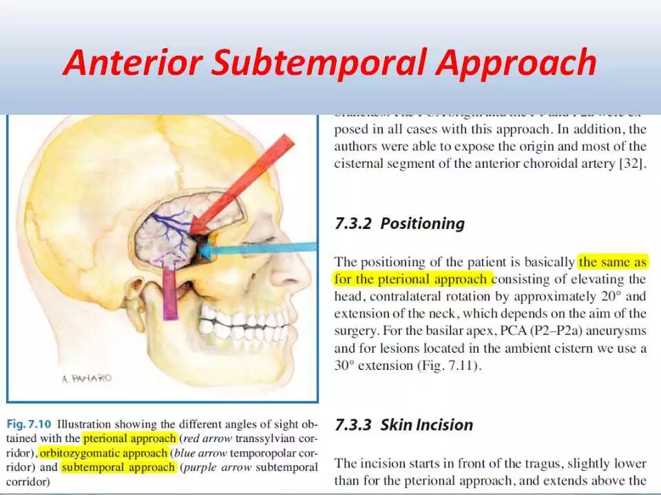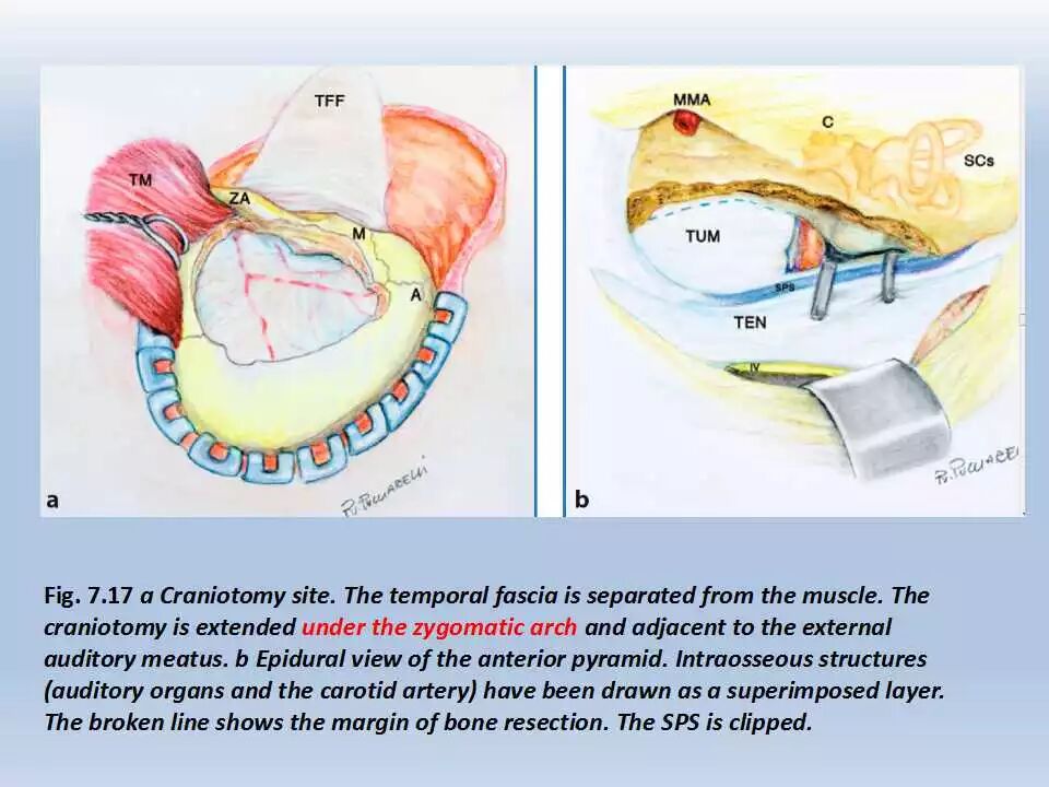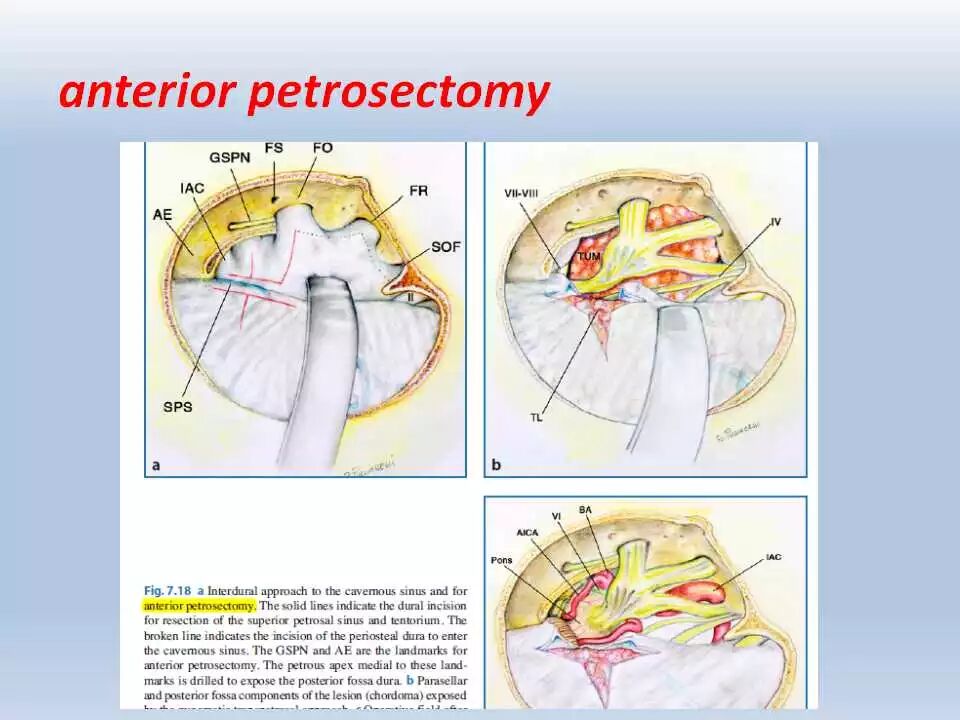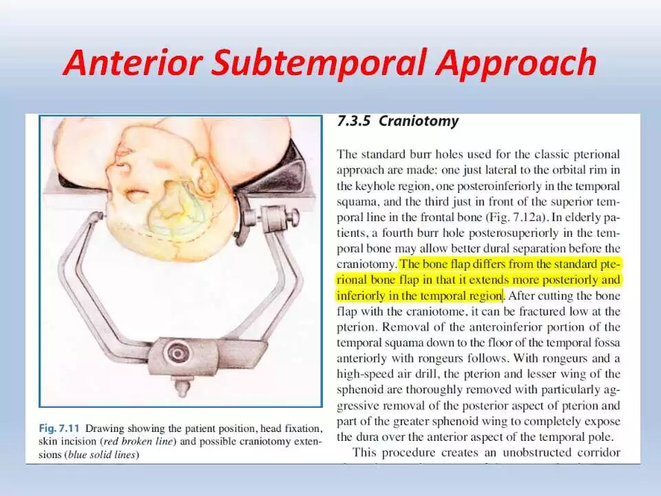 经颞开颅术是一种在脑内和脑外病变切除中广泛应用的简单易行的入路。颞下入路为显露中颅窝底、上岩斜区和与其相关的脑池提供了宽敞的手术通道。具体来说,通过岩骨前部切除术,这一通道可到达脑干的前上方。