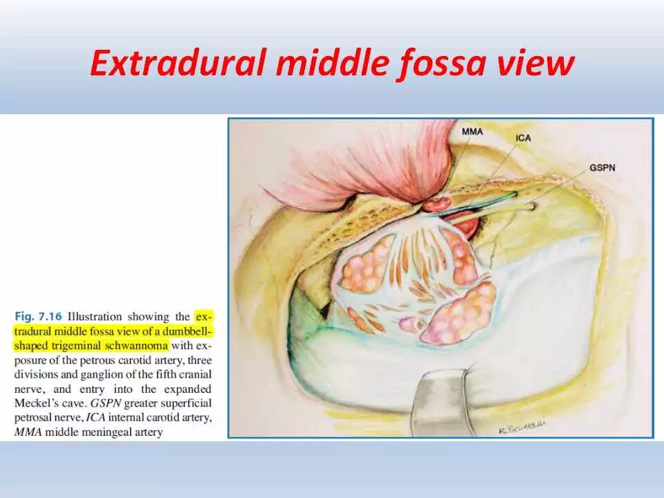 有时,可沿中颅窝行硬膜外分离以切除颅底的病变。术前预估Labbe静脉的位置非常重要。调整硬膜剪开和硬膜外抬起颞叶的位置以保护这一重要的静脉结构。可进一步通过腰大池引流脑脊液以进一步松弛脑组织。