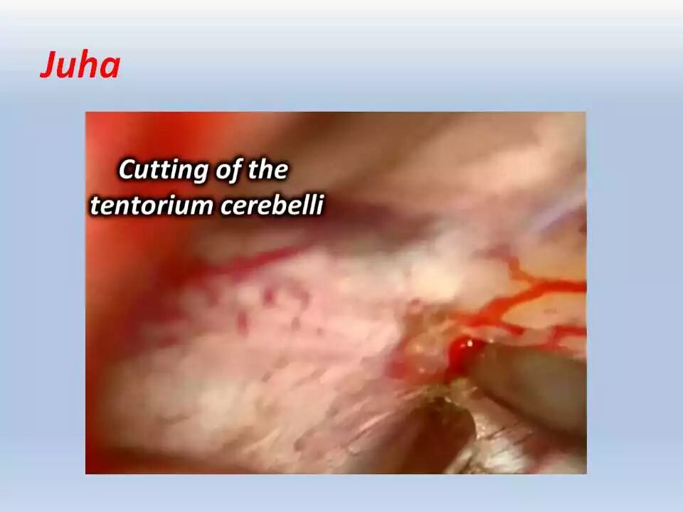 应明确与小脑幕缘走形一致的动静脉结构的移位情况。术前应计划好是否对扩展到幕上下的肿瘤采取联合入路。