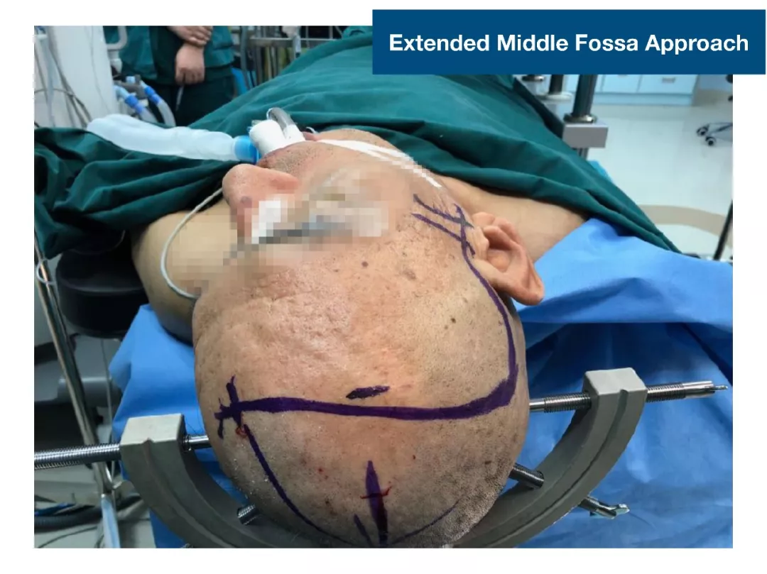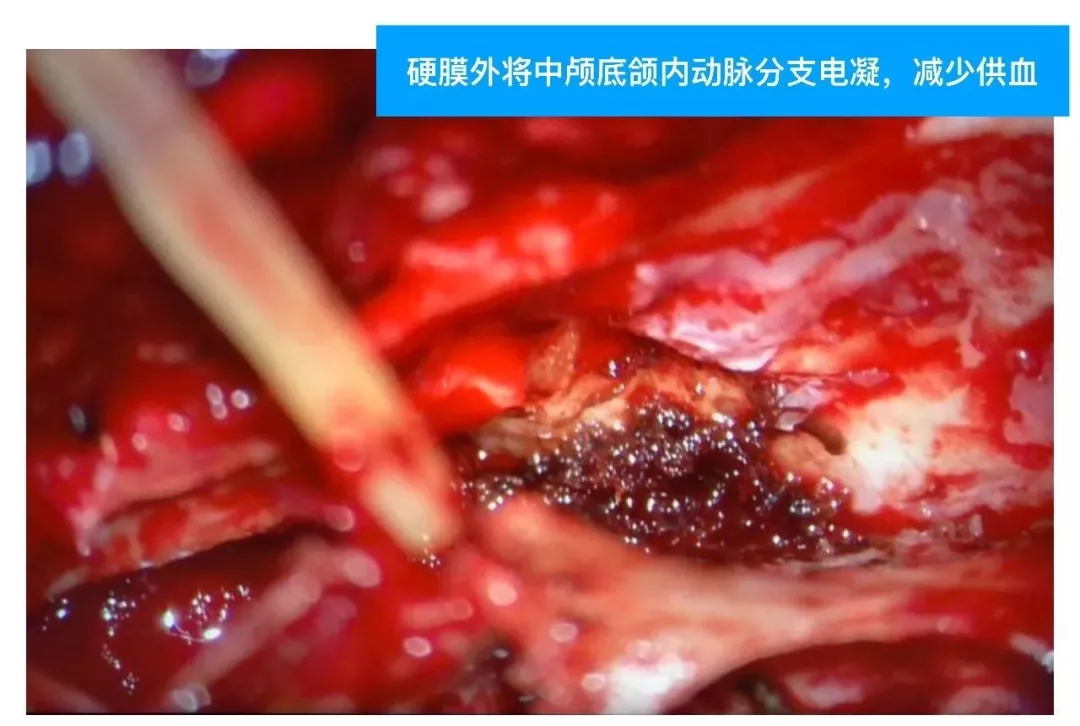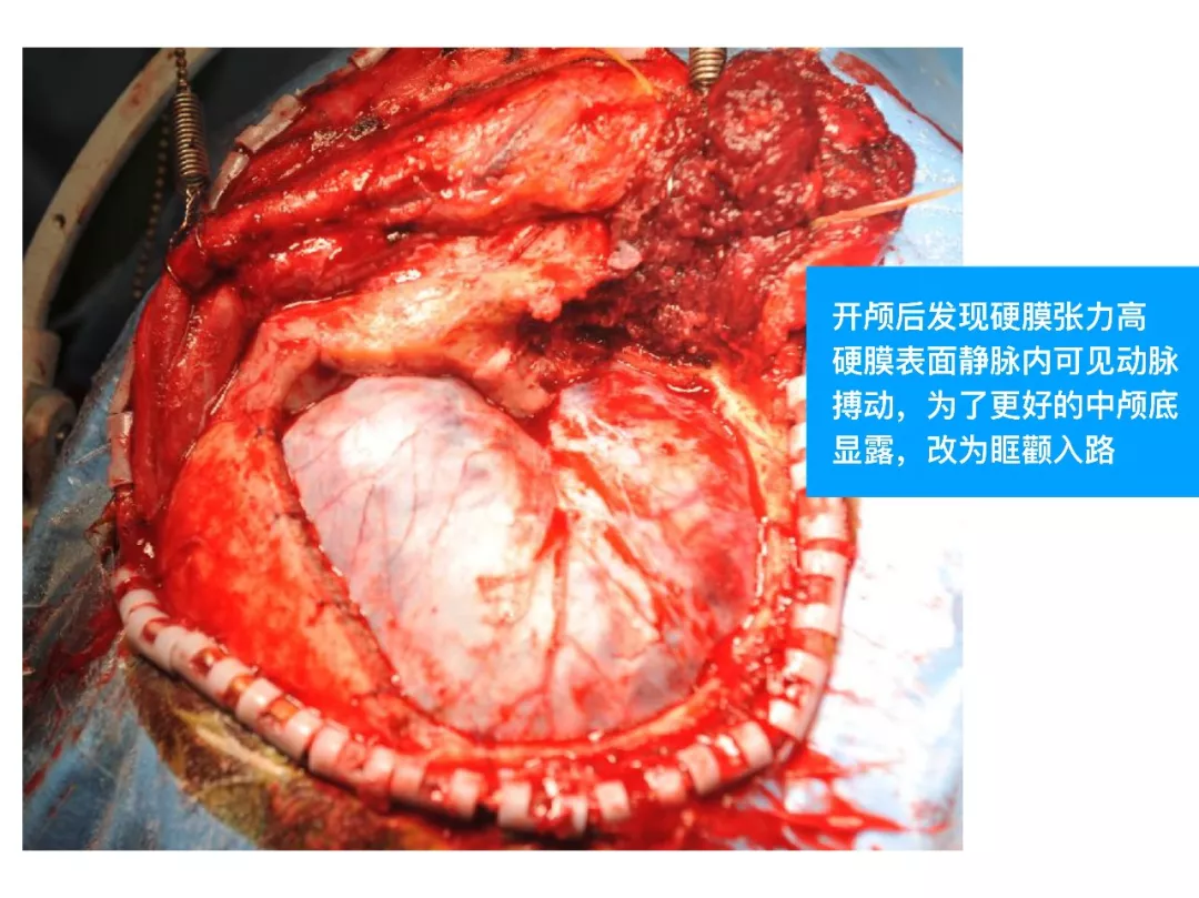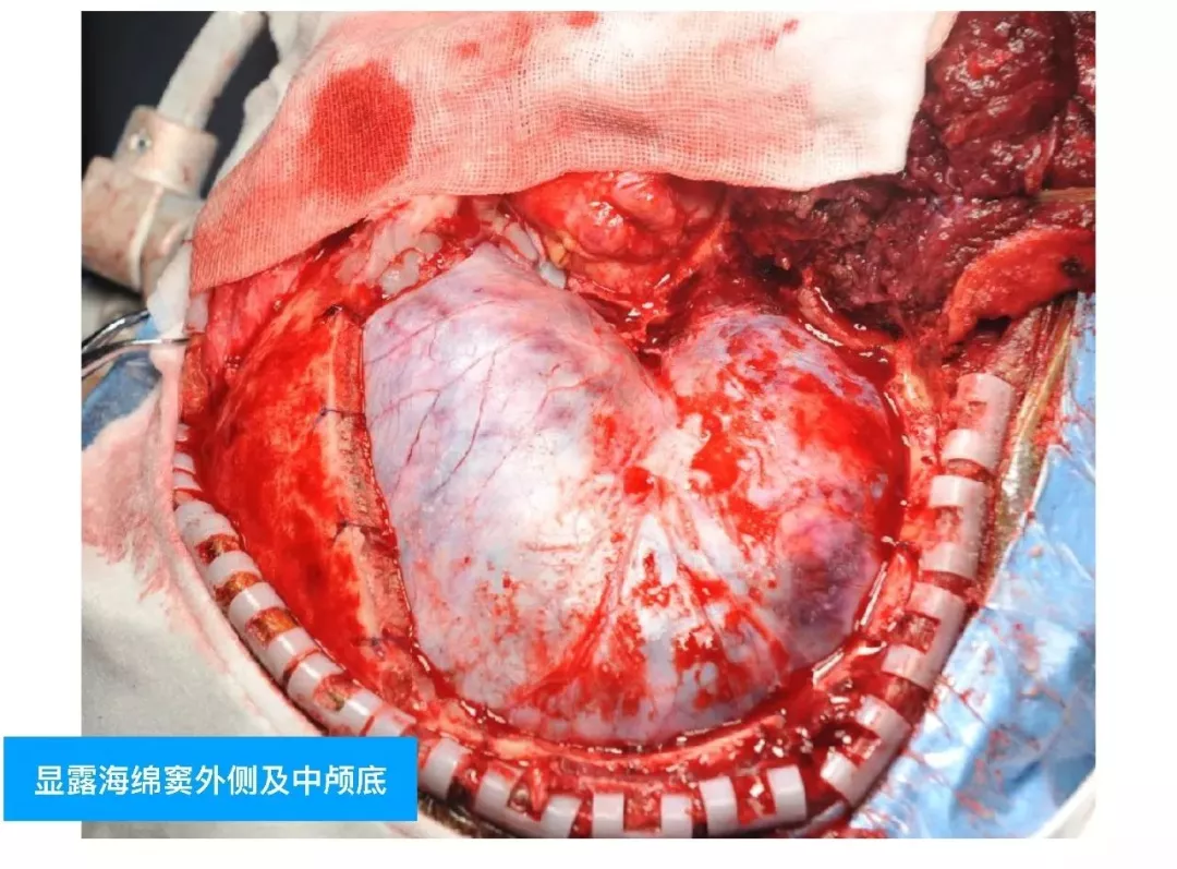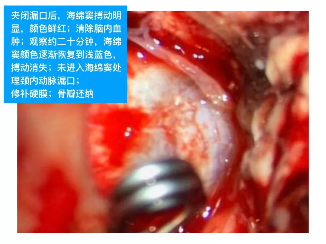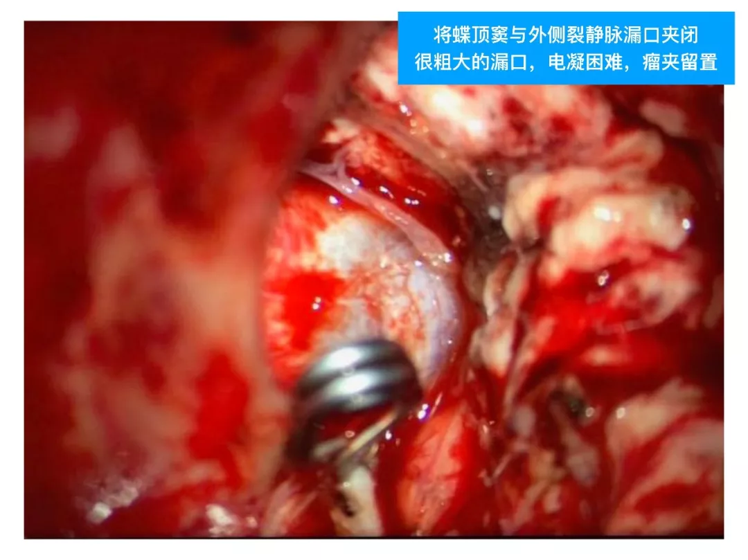 (3)对于此类DAVF,主要是蝶顶窦与海绵窦之间的逆流;扩大的中颅底入路,先闭塞引流入海绵窦的颈外动脉颌内动脉分支;然后将一侧海绵窦所有的漏口夹闭,切断所有的脑静脉与海绵窦逆流;