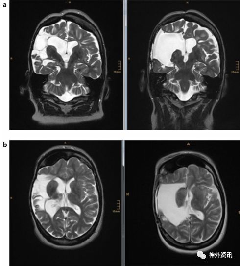 图1. a.FH术前 MRI-T2像;b.术后MRI-T2像。