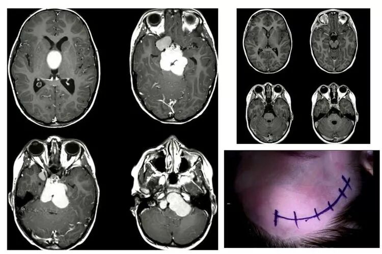 其一,患者是首次手术切除,无先前不当治疗之遗害。没有经历P32内放疗,没有经历伽玛刀治疗。这样的病例,肿瘤边界粘连较轻,易于分离、牵拉。