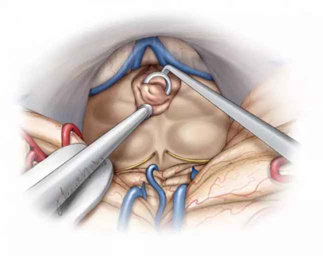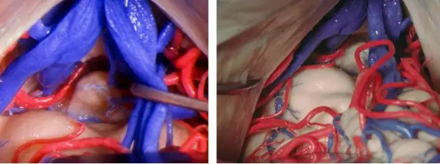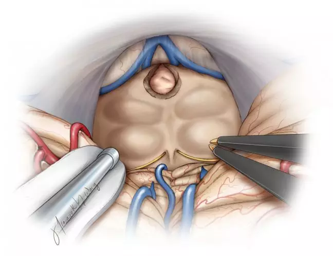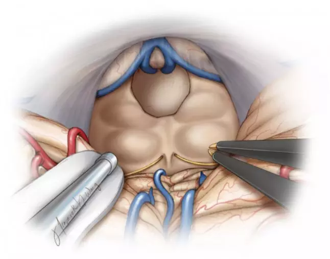 仔细研究术前影像资料,必须确定与肿瘤相关的脑内静脉、Rosenthal静脉和Galen静脉的定位。如果这些静脉被推移至肿瘤的前后侧而并非上方,则禁忌应用小脑上经脑室入路。
