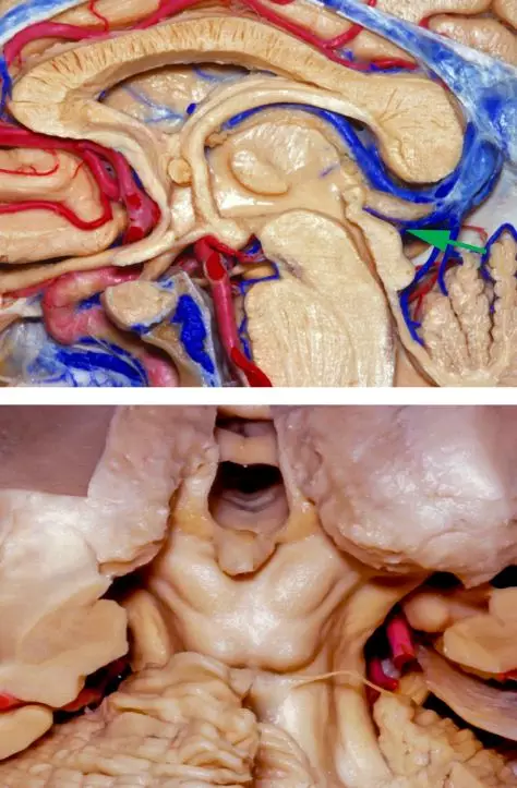 图3. 绿色箭头示小脑上经脑室入路手术路径(上图)。经松果体上通道显露脑室(下图)。当三脑室后部病变侵及后壁,无论是在松果体上方,或更常见于下方且侵及顶盖区时均适于此入路(图由Rhoton, AL授权)。
