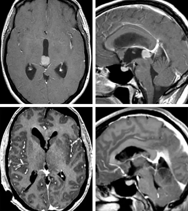 由于临近三脑室及中脑导水管,此区域肿瘤患者常引起梗阻性脑积水。瘤内出血(松果体卒中)的患者可出现Parinaud综合征。尽管体积小,但位于此区域的许多病变仍需手术治疗,包括海绵状血管瘤、松果体母细胞瘤以及中等分化的松果体实质肿瘤。