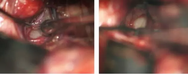 图8. 患者取坐位,通过后正中小脑上入路显露图2显示的肿瘤。注意左侧顶盖的颜色差异(左图,吸引器顶端)。切除侵及顶盖部分后才可进入脑室并全切除肿瘤(右图)。