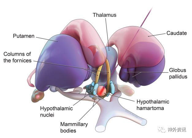 图1. 激光消融导管置入下丘脑错构瘤的轨迹和下丘脑周围重要结构示意图。Thalamus:丘脑;Caudate:尾状核;Putamen:壳核;Columns of the fornices:穹窿柱;Globus pallidus:苍白球;Hypothalamic hamartoma:下丘脑错构瘤;Hypothalamic nuclei:下丘脑核;Mammillary bodies:乳头体。