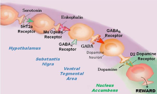 多巴胺也参与情绪变化、学习和记忆。比如大脑的“奖赏中心”就是由多巴胺起重要作用,故而也称作“多巴胺系统”,这个系统作用机制如下图,细胞分泌5-羟色胺作用于受体,促进受体细胞分泌脑啡肽。脑啡肽又继续刺激靶细胞产生氨基丁酸(GABA),随后接到信号的多巴胺神经元分泌多巴胺,这种物质刺激奖赏中心,最终影响我们的情绪。所以很多帕金森患者存在焦虑、抑郁等精神方面的一些症状。