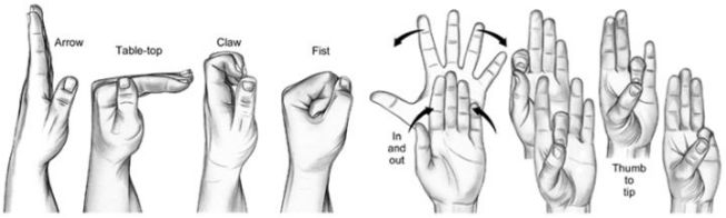 (1)上肢前伸,紧握拳,约5秒;尽力张开手掌,约5秒;频率可自己调整;或反复紧握弹力球也可以;