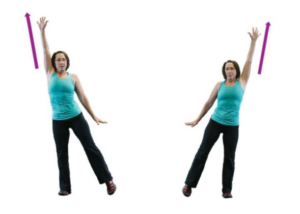 5. 站位,双足分离与肩同宽,双上肢分离,将身体重心偏向右侧,左足缓慢离地,同时右上肢举过头顶,重身体心偏向右侧,保持5~10秒,恢复双足站立,休息5秒,换反方向重复,每个周期循环4~5次。