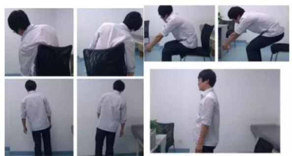 准备椅子、瑜伽垫,需要技师或者家属协助。坐位,双腿并拢,起立准备,双上肢前伸,缓慢弯腰,抬起臀部,缓慢站起