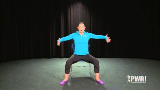 4. 坐位,双腿平分两侧,双臂张开,保持上半身不动,依靠双腿力量缓慢站起,保持5~10秒,缓慢恢复坐位,每个周期循环3~4次。