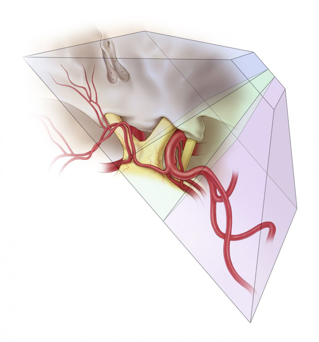图2. 笔者时常会首先设想对于特定病变的最佳暴露方式,然后倒推去寻找安全到达病变的入路。在打开硬脑膜之前,笔者也会常规地将病变切除后手术区域最终看到的视觉景象在脑海中形成概念,以便更快地达成手术目的。如图所示,笔者构思了一幅病变深部重要结构(如视神经等)的三维解剖图,然后设计手术入路以到达毗邻的病变部位。