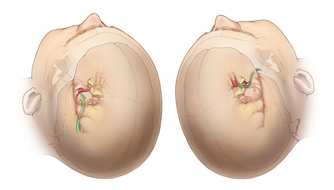 当该入路联合眉弓切口时,就死是一个侵袭性极小的锁孔入路。与标准翼点入路暴露额底相比,眶上额底途径更靠前,虽然使手术操作距离变长,但相应地减少了对大脑的骚扰和牵拉。有策略地以吸引器和手术器械进行动态牵拉,使得眶上额底路径有着灵活的操作角度和充足的手术空间以应对包括前循环动脉瘤和巨大前颅底肿瘤在内的复杂病变。