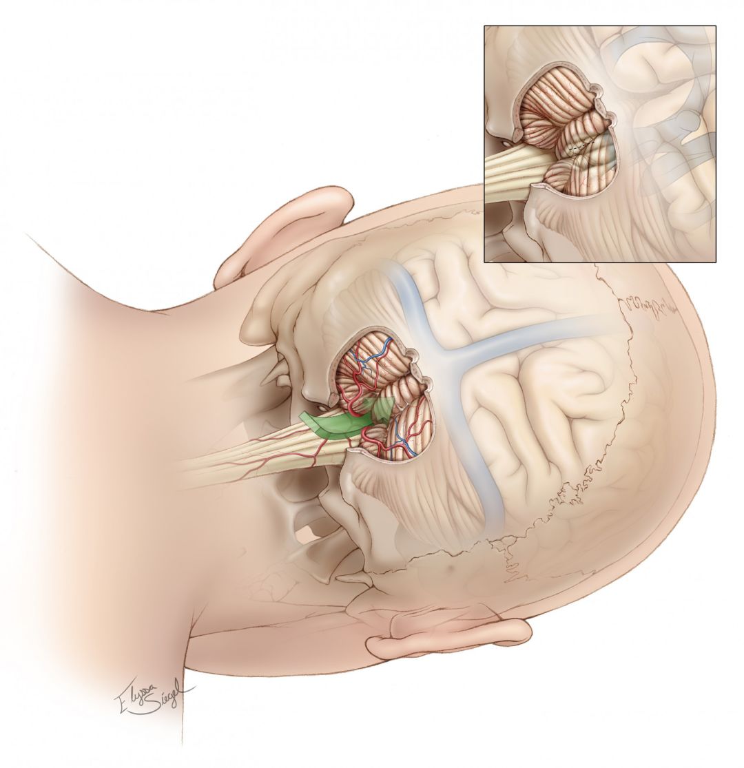 图5. 图示为显露桥脑小脑角的手术路径。图中展示了显露VII/VIII颅神经复合体上方病变(小脑侧上方路径:图中蓝色箭头)和下方病变(小脑侧下方路径或小脑绒球下路径:图中绿色箭头)的手术路径。