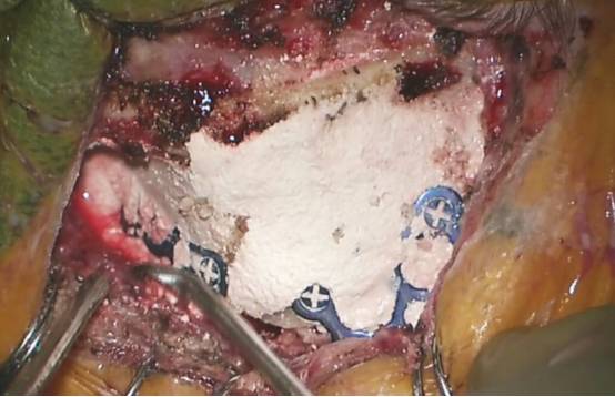 图12. 骨瓣还纳并用连接片固定,对开颅所致的骨瓣周缘的凹陷和缝隙进行修补,用图中的白色物质填充,最大程度恢复美观。连接片不应在额窦上方固定,因为固定钉会拧入额窦导致脑脊液漏。
