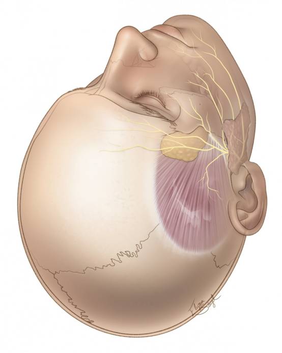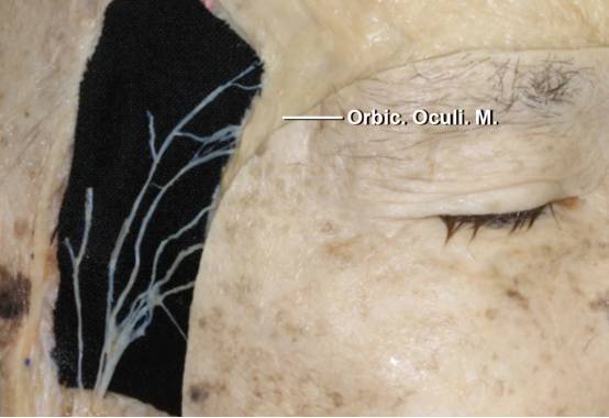 图3. 切开眉弓并翻起关键孔处脂肪垫,此处有损伤面神经额支的风险。行眉弓切口时将这些分支保留在肌肉中随肌肉牵向后方。这些分支走行于脂肪垫浅层的筋膜中,因此不应横行切开脂肪垫。