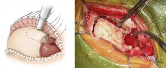 图7. 行Soutar切口时,抬起关键孔上方的颞肌(左图)保护面神经额支,有助于术后美观。行眉弓切口时,开颅只需打一枚骨孔(右图)。骨膜瓣备用以防开放额窦。