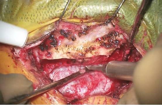 图11. 避免使用固定脑压板以免损伤额叶底面皮层。能看到一例大型前交通动脉瘤夹闭后额叶底面的情况。水密性连续缝合硬膜,额窦开放时尤须如此。骨膜瓣可用于修补缝合硬膜或反转覆盖开放的额窦。若额窦未开放,硬膜水密性缝合并非必须。