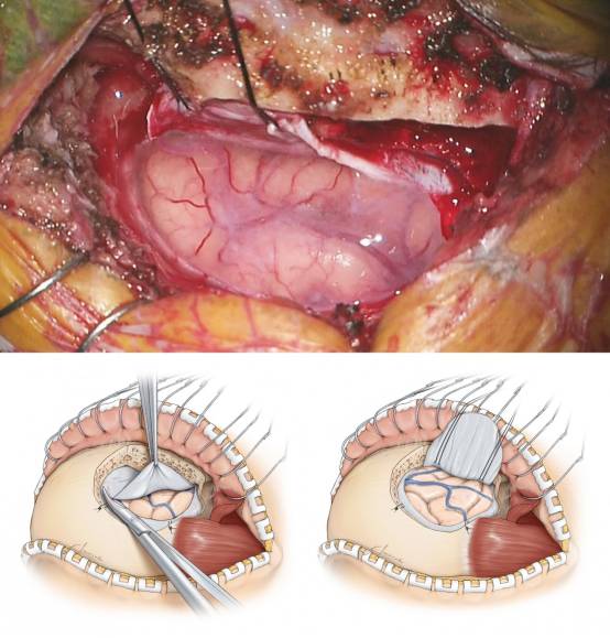 图9. 常规悬吊硬膜防止出血,U型剪开硬膜。硬膜朝面部翻开,保持湿润便于术后水密性缝合。可以看到眉弓切口的主要局限在于骨窗的高度受限(上图),所以务必确保平行于眶顶的视角不能有额骨阻挡。