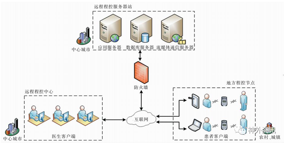 (1)医生客户端:位于中心城市的远程程控中心,采用安装PINS远程程控系统的计算机实现,由程控医生操作;