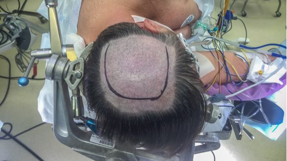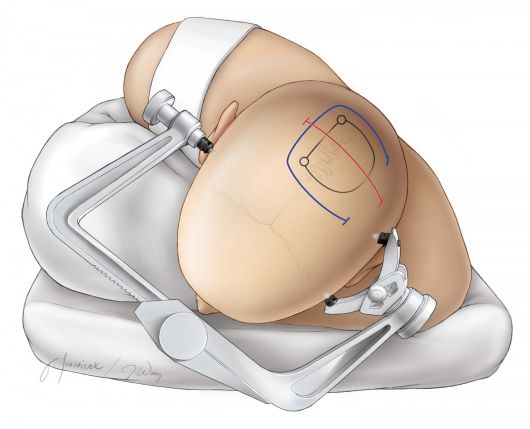 图4. 头架固定患者头部。头架安装注意以下两点:第一,单钉侧与双钉侧的连线必须与患者头部水平面平行,以避免头架固定失败或头部滑脱。第二,颅钉固定位置因尽量避免靠近头顶。这样的固定方式可以利用重力作用使对侧半球回缩,扩大经纵裂操作的手术空间。该头位与下图所示的位置正好相反,为暴露皮层或大脑凸面的病变,病变需置于术野最高点以利于操作。