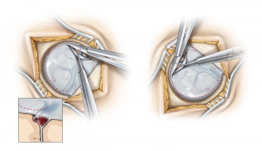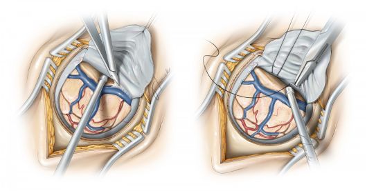 由于术前中线旁静脉湖范围的不可预测性,中线旁切开硬脑膜时可能会引起矢状窦侧壁的细微撕裂,可通过良好的缝合技术缝合裂口,而双极电凝则可能因引起硬脑膜的收缩而使裂口扩大。