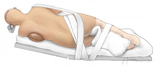 图3. 图示患者取侧俯卧位,上半身稍向前倾(约135°)。该体位可有效避免因手术需要使颈部过分屈曲,该技巧也同样适用于仰卧位手术。此外,侧卧位也可以使脑外的病变更易暴露,因其重力作用也可更好地对纵裂旁的病变进行暴露和操作。由于术中倾斜手术床可能存在引起患者体位移位的风险,患者必须稳妥的固定于手术床。