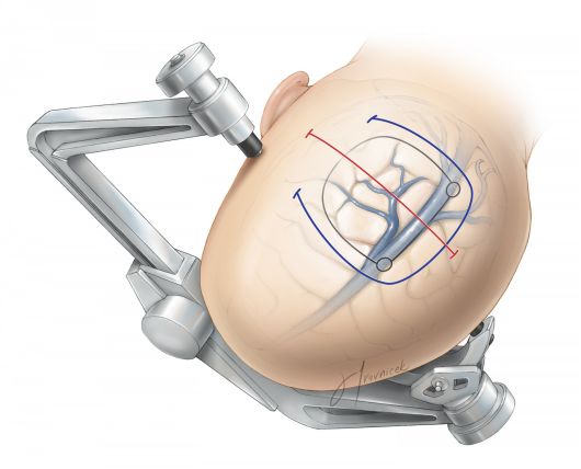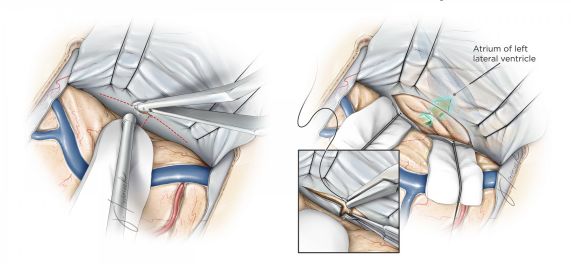 顶部开颅也可用于处理侧脑室中线病变的手术。传统入路通常经顶上小叶皮层造瘘暴露病变,该手术入路有导致本体感觉丧失,以及语言障碍,视觉处理能力下降和空间意识障碍的风险。最近研究显示,对有特殊职业和活动需求的患者而言,这些功能缺陷对他们的生活质量影响显著。