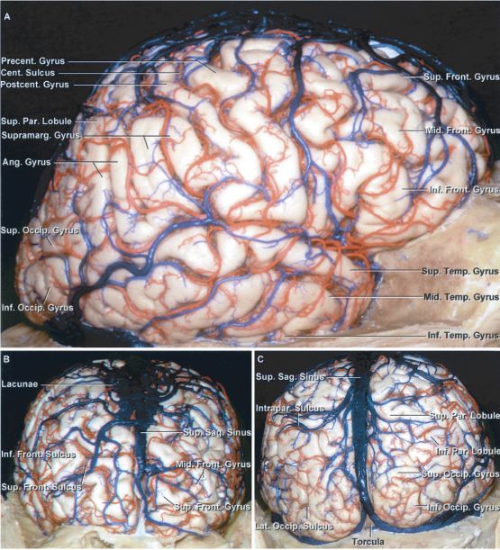 图1. 大脑的侧面观(A)、前面观(B)和后面观(C)。C图所示顶间沟将顶上小叶和顶下小叶分开。矢状窦旁的桥静脉大小和位置多变,是两侧大脑半球重要的引流静脉。B图所示当开放硬膜的范围过于接近中线时,需特别注意的沿上矢状窦分布的静脉湖。(图片由AL Rhoton, Jr授权)。