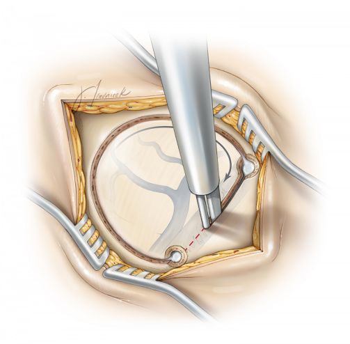 笔者一般会在大脑镰上基底处缝合数针以轻柔牵拉上矢状窦,进一步开放纵裂处的操作空间和视角。(右图)。