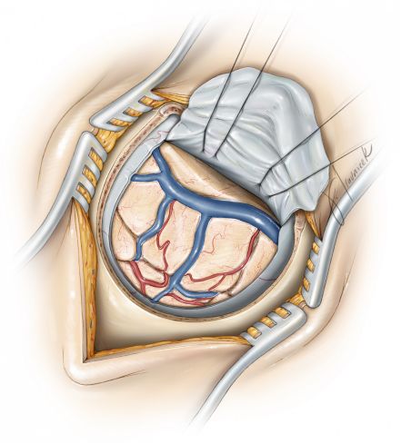 取下骨瓣后,可以用含凝血酶的明胶海绵或止血纱控制静脉窦壁的轻中度出血,在关颅时一般保留放置的止血纱。更多有关静脉窦损伤处置的细节,请参阅颅脑手术原则相关章节。