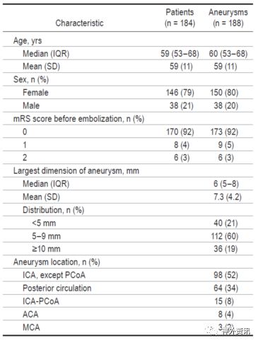 表1. 184例含188个动脉瘤患者的基本特征。
