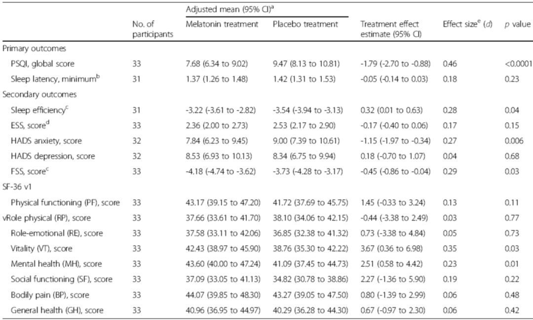 研究结果表明,与安慰剂相比,服用褪黑素能够显著改善睡眠,褪黑素组PSQI为7.68,安慰剂组9.47,平均差=-1.79;95% CI,-2.70~-0.88(p ≤ 0.0001)。但对入睡延迟无明显改善作用,褪黑素组PSQI为1.37,安慰剂组1.42,平均差=-0.05;95% CI,-0.14~0.03(p =0.23)。此外,褪黑素能够改善患者睡眠效率和健康调查简表(SF-36)评估的患者活力和心理健康状况(p<0.05)。服用褪黑素的疗效还表现在改善患者的焦虑感和疲劳感(p<0.05),但对患者白天嗜睡的症状无明显影响(p=0.15)(表1)。研究过程中未监测到严重不良反应发生。
