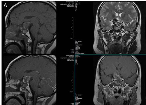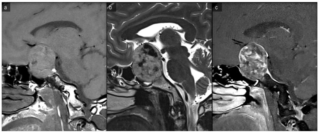 图2. 垂体MRI检查,显示鞍内肿瘤向鞍上发展,边界清