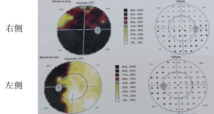 图1. 视野检查结果,显示左侧颞侧视野缺损,右侧大部分缺失。