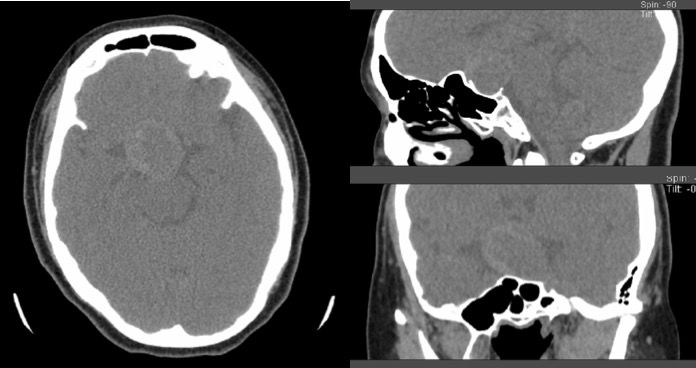 鞍区CT:鞍区内见软组织团块灶,平扫中间稍低密度,周边呈稍高密度,未见钙化灶,邻近骨质受压吸收(图3)。