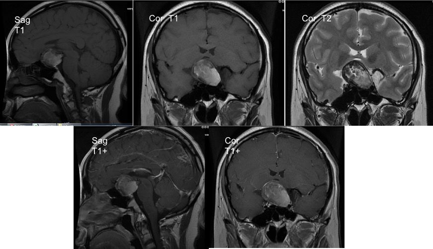 患者,男性,28岁,因“进行性双眼视力下降14年伴复视1年”,经当地医院MRI检查,诊以“鞍上肿瘤”于2017年12月13日入院。