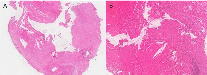 图6. A:H&E染色10X;B:H&E染色 20X 可见并见大量嗜伊红色变性坏死组织