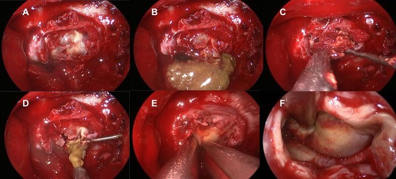 图4. A.咬除鞍底菲薄骨质,显露肿瘤;B.切开鞍底硬膜,黄变泥沙样内容物涌出;C.切除肿瘤,瘤体色红,稀软易碎;D.进一步刮除残余黄变内容物;E.剥除肿瘤残存包膜;F.肿瘤完整切除,残腔未见明显出血。