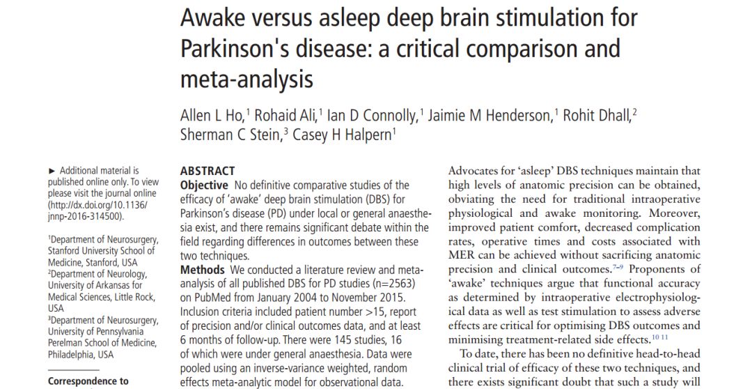 2017年3月,Allen、Rohaid等人在JNNP杂志上发表Meta分析结果,该文章收集2004年1月至2015年12月间发表的清醒和麻醉状态下治疗PD患者的DBS手术效果论文,选出其中145项有效研究论文,即治疗病例超过15例、术后随访时间超过6个月,其中全麻状态下DBS手术有16项有效论文。