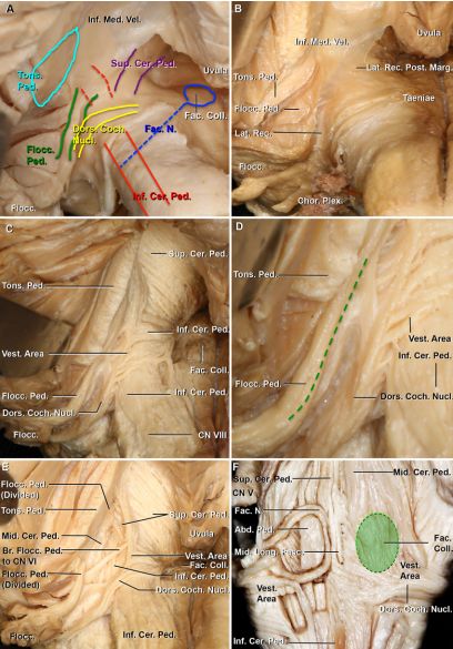 图4. A.后下位观,左外侧隐窝打开后显示周围神经结构毗邻关系。蓝实线表示面神经丘;蓝虚线表示小脑下脚腹侧面神经走行;红线表示小脑小脚,走行于延髓背外侧;绿线表示绒球脚,走行于绒球背侧;黄线表示背侧蜗神经核,在外侧隐窝腹侧壁形成突起;紫线表示位于四脑室外侧壁的小脑上脚腹内侧部走形;天蓝色椭圆区表示腹侧扁桃体脚至绒球脚位置;B.打开左侧隐窝,绒球脚位于扁桃体脚尾部,下髓帆附着于绒球脚和绒球尾部;C.外侧隐窝表层纤维束解剖。绒球脚从走形于腹内侧,从尾部直到扁桃体脚;前庭区位于从尾部至绒球脚处;面神经丘位于四脑室底部;D.面神经丘放大观,背侧蜗神经核位于前庭区,形成一个突起;绒球脚与背侧蜗神经核之间的空间为前庭区;绿色虚线表示假定进入桥脑的安全切口线;E.左外侧隐窝深部。切除部分绒球脚,小脑中脚位于绒球脚腹侧,桥脑下方;小脑上脚位于绒球脚上部腹侧和内侧;小脑下脚位于绒球脚内侧和前庭区腹侧;F.四脑室底部纤维束解剖后位观,右侧显示表层纤维束,左侧显示深层纤维束。绿色椭圆代表面神经丘,外侧隐窝几乎由前庭区覆盖,面神经位于外展神经周围,小脑上脚位于外侧隐窝腹侧。