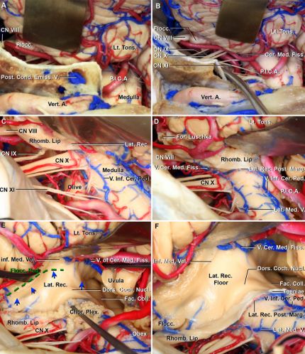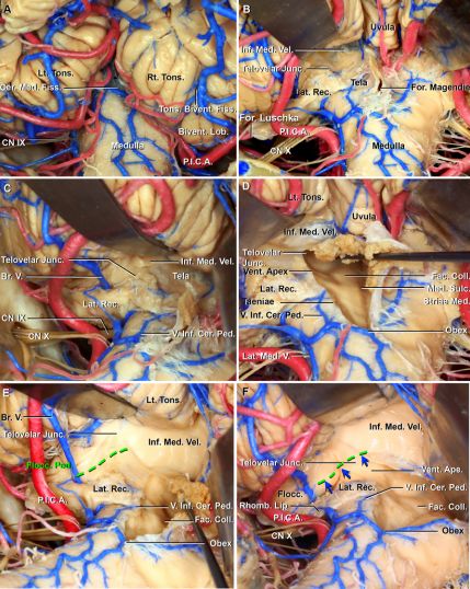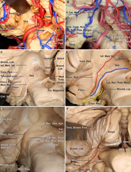 图3. A.外侧隐窝周围动脉的关系,小脑延髓裂左半部后位观放大图。PICA供应脉络组织、菱唇内侧部及外侧隐窝脑池段外侧部、背部和内侧部;B.外侧隐窝周围静脉关系,小脑延髓裂左半部后位观放大图。切除扁桃体,小脑延髓裂静脉通过外侧隐窝背侧进入绒球,下髓帆静脉沿延髓外侧缘通过下端腹侧进入外侧隐窝后缘;C.分开左侧扁桃体脚,切除扁桃体。扁桃体脚位于沿扁桃体的上外侧部;扁桃体脚连接下髓帆,边界不清晰,是附着于扁桃体至小脑的唯一神经组织;D.小脑绒球脚、脉络组织和菱唇之间的界限和毗邻关系。红线表示膜髓帆交界;蓝线表示脉络组织和菱唇交界;黄线表示菱唇边缘;E.切除左侧扁桃体,打开外侧隐窝。绒球脚位于扁桃体脚腹侧,面神经丘是安全进入四脑室底部的标记,其附着于下髓帆直到Luschka孔;背侧蜗神经核在外侧隐窝背侧表面有一突起;F.下面观,扁桃体二腹裂位于扁桃体和二腹叶之间,止于脑池段背侧水平部;扁桃体内侧部空间为扁桃体二腹裂内侧部空隙。