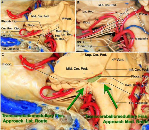 作者指出,外侧隐窝可分为延髓段和脑池段两部分。经小脑延髓裂外侧和内侧入路至外侧隐窝后下方,可以获得约140°~150°的视野范围。绒球脚沿外侧隐窝腹侧走行,可作为进入桥脑下部的安全切开区域。通过选择恰当的入路,经小脑延髓裂内侧至外侧或从外侧至内侧,或两者联合入路均可为从外侧隐窝周围暴露桥脑下部提供足够的空间。