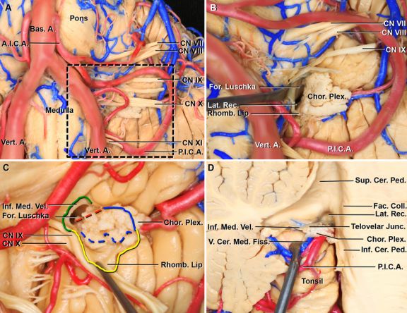 图2. A.小脑和脑干岩骨面前外侧观,脑室至侧隐窝的结构包括绒球和颅神经(CN)VII–XI;Luschka孔隐匿于CN IX和X后方,黑色方框内放大图B;B.去除CN X后,菱唇为一薄层神经组织,向前牵开菱唇打开Luschka孔,从侧隐窝露出脉络丛;C.前面观放大图,显露脉络组织、菱唇和下髓帆之间的关系,绿色线表示下髓帆边缘,黄色线表示菱唇边缘,蓝色实线表示脉络组织,红色线表示膜髓帆交界,蓝色虚线表示菱唇和脉络组织交界;D.侧隐窝内侧面观,侧隐窝外侧小脑延髓裂静脉。脑池段前壁由下髓帆构成,后壁由菱唇和脉络组织形成。