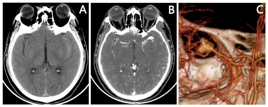 图1. 患者入院后行头颅CT和CTA检查结果提示左侧大脑中动脉瘤。(A)术前头颅CT平扫提示左侧侧裂池蛛血;(B)术前头颅CTA增强原始片提示左侧侧裂池团状异常高密度影;(C)术前头颅CTA三维重建片提示左侧大脑中动脉分叉部(主干和颞前动脉分叉部)大动脉瘤(约8mm)。